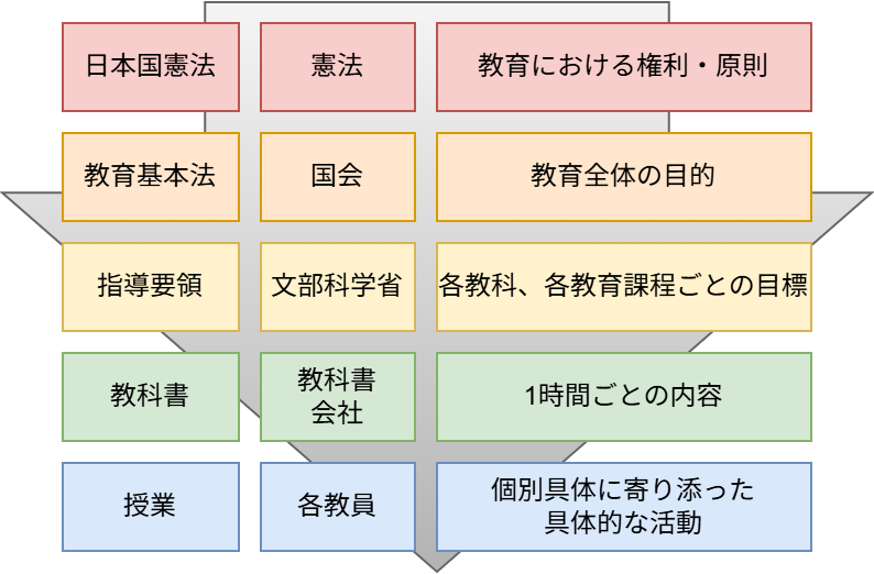 以上より、憲法から授業までが明確に繋がって、教育が構成されていることが分かりました。