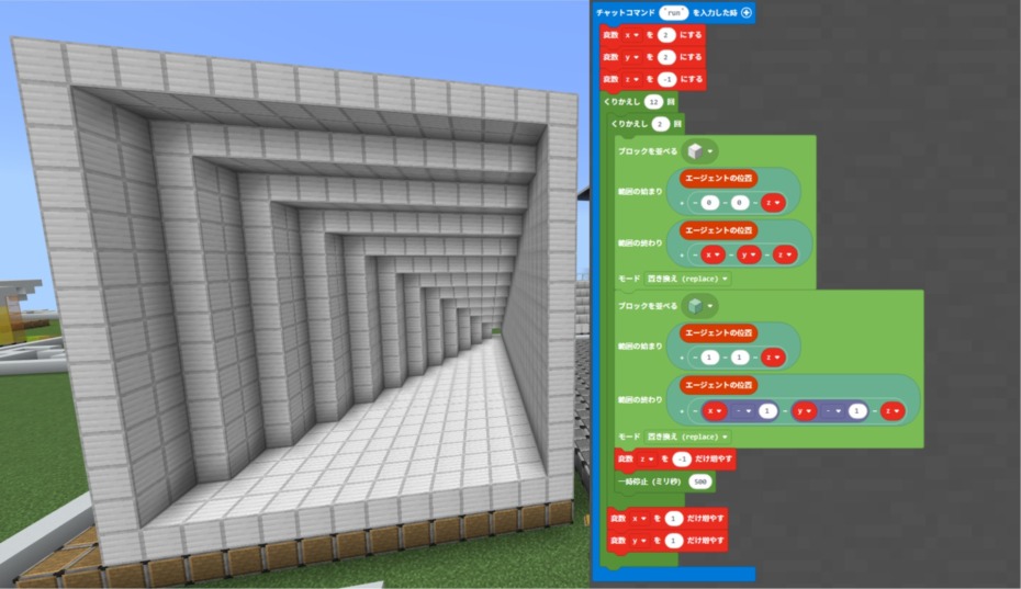 自分でつくるものを企画し、マイクラ内で実際に遊べるようにプログラムを作成します。